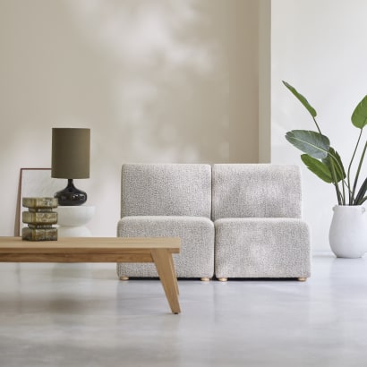 2-Sitzer-Modulbank Swann aus massivem Akazienholz mit grauem Stoffbezug