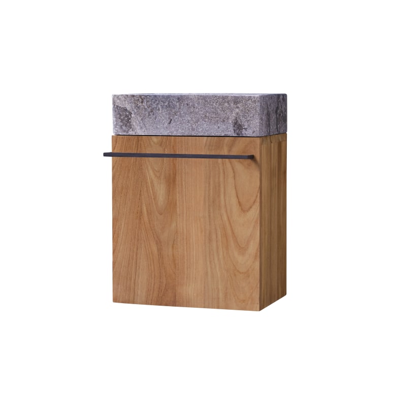 Modern und cool: Der Waschtisch Stelle grey aus massivem Teakholz mit FSC®-Zertifikat! und mit grauem Marmor  Eine perfekte Kombination und dazu noch die praktische Komponente: Der in der Türe integrierte Handtuchhalter und die beiden dahinterliegenden Fächer. Auch ist er durch die hängende Wandmontage sehr platzsparend und gibt Ihnen viel freien Fußfraum. Er  lässt er sich sowohl im Badezimmer als auch in der Gästetoilette spielend anbringen.