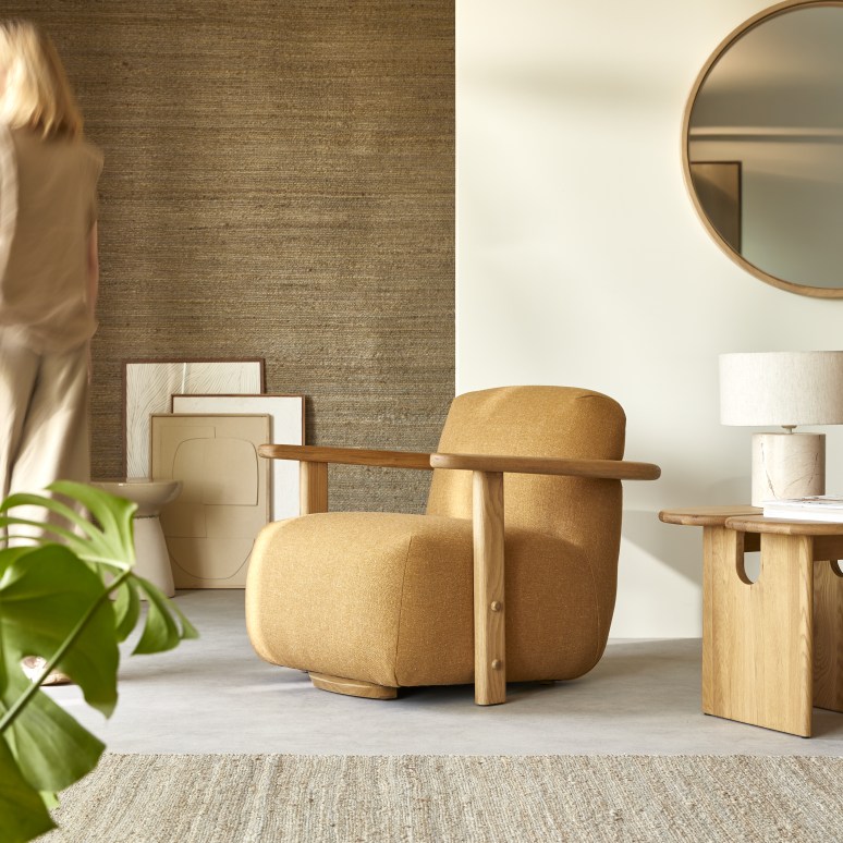 Sessel aus massiver Eiche und kamelbraunem Stoff